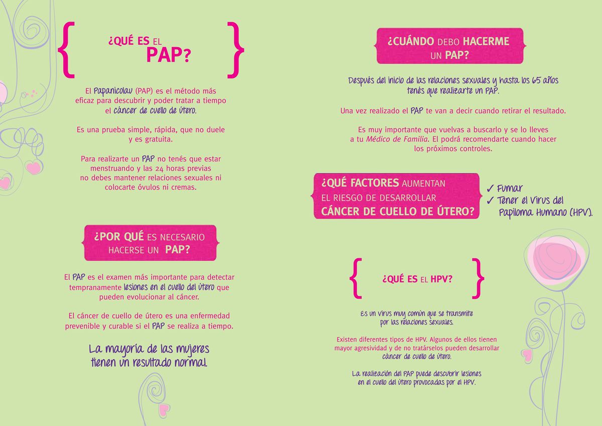 La mayoría de casos se diagnostican entre los 35 y los 50 años, con una edad media al diagnóstico de 48 años. Sólo el 10% corresponde a mujeres mayores de 65 años La causa fundamental del tumor es la infección persistente por el virus del papiloma humano (VPH), un virus que se transmite por contacto sexual, y que participa también es la causa de los cánceres de vagina, vulva, ano, pene, orofaringe y cavidad oral Otros factores que se relacionan con una mayor incidencia de cáncer de cuello de útero son el tabaquismo (que incrementa 2-3 veces el riesgo de desarrollar cáncer en mujeres con VPH), la inmunosupresión (pacientes VIH, tratamiento con inmunosupresores, etc.), el uso prolongado de anticonceptivos orales (por más de cinco años), la multiparidad y la confección con otras enfermedades de transmisión sexual como el herpes genital El 26 marzo se conmemora el Día Mundial de la Prevención del Cáncer de Cuello Uterino a modo de establecer acciones de concientización e información sobre la importancia de efectuarse controles ginecológicos para evitar enfermedades, entre ellas, el cáncer Como se puede Prevenir ? - Usar preservativo: el uso correcto de preservativo durante las relaciones sexuales puede reducir el riesgo de infección por VPH en mujeres hasta un 70%. - Aplicar la Vacuna del Papilomavirus: la vacuna es una herramienta muy eficaz que permite inmunizar contra el cáncer de cuello de útero. El Calendario Nacional de Vacunación contempla la aplicación de dos dosis a todos los niños de 11 años: 1° dosis y la 2° dosis a los seis meses de la primera En nuestro país la profilaxis del VPH mediante vacunación es obligatoria y gratuita. - Realizar el Papanicolaou(PAP) todas mujeres asintomáticas deben realizar la prueba de PAP a partir de los 25 años y cada 3 años si tiene dos PAP consecutivos negativos El PAP es un estudio sencillo, que no produce dolor y que permite detectar si existen lesiones en el cuello del útero para poder tratarlas a tiempo. - Podes hacer la prueba de PAP de manera gratuita en el Centro de Salud más cercano a tu domicilio