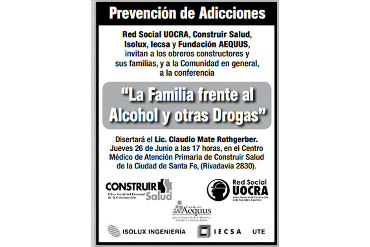 Desde hace tres años, Construir Salud y Red Social UOCRA desarrollan un Programa de Prevención de Problemas Asociados al Consumo de Alcohol y Otras Drogas. En el marco de este Programa, y en conjunto con las Empresas Isolux, Iecsa y la Fundación AEQUUS, se realizó el pasado 26 de junio, en el Centro Médico de la Ciudad de Santa Fe, una conferencia abierta a la comunidad bajo el lema: "LA FAMILIA FRENTE AL ALCOHOL Y OTRAS DROGAS", dictada por el experto Lic. Claudio Mate Rothgerber. Estuvieron presentes Autoridades relacionadas con el abordaje de las adicciones, del gobierno de la Pcia. de Santa Fe, responsables de empresas constructoras, autoridades sindicales de UOCRA, junto a beneficiarios y sus familias. Otras actividades, que forman parte de esta iniciativa, se están desarrollando en la obra a cargo de las Empresas Isolux e Iecsa, correspondiente a la Termoeléctrica "Brigadier López" , ubicada en Sauce Viejo , a pocos kilómetros de la ciudad de Santa Fe. Esas actividades están especialmente dirigidas a los Delegados y Obreros con el objetivo sensibilizar, informar e introducirlos en prácticas preventivas relacionadas con la problemática de los incidentes laborales relacionados con el consumo de sustancias. A fines de agosto, se realizará una nueva conferencia dirigida a la Comunidad y actores sociales involucrados en la temática de la Prevención de las Adicciones.