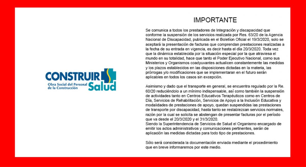 Se comunica a todos los prestadores de Integración y discapacidad que conforme la suspensión de los servicios realizada por Res. 63/20 de la Agencia Nacional de Discapacidad, publicada en el Boletíon Oficial el 19/3/2020, solo se aceptará la presentación de facturas que comprendan prestaciones realizadas a la fecha de su entrada en vigencia, es decir hasta el día 20/3/2020. Toda vez que la dinámica establecida por la situación especial por la que atraviesa el mundo en su totalidad, hace que tanto el Poder Ejecutivo Nacional, como sus Ministerios y Organismos coadyuvantes actualicen constantemente las medidas y los plazos establecidos en las disposiciones dictadas en la materia, las prórrogas y/o modificaciones que se implementaran en el futuro serán aplicables en todos los casos sin excepción. Asimismo y dado que el transporte en general, se encuentra regulado por la Re. 60/20 reduciéndolo a un mínimo indispensable, así como también la suspensión de actividades tanto en Centros Educativos Terapéuticos como en Centros de Día, Servicios de Rehabilitación, Servicios de Apoyo a la Inclusión Educativa y modalidades de prestaciones de apoyo, quedan suspendidas las prestaciones de transporte por discapacidad, hasta tanto se restablezcan servicios normales, razón por la cual se solicita se abstengan de presentar facturas por el período que va desde el 20/3/2020 y el 31/3/2020. Siendo la Superintendencia de Servicios de Salud el Organismo encargado de emitir los actos administrativos y comunicaciones pertinentes, serán de aplicación las medidas dictadas para todo tipo de prestaciones. Sólo será considerada la documentación enviada mediante el procedimiento que en breve informaremos por este medio.