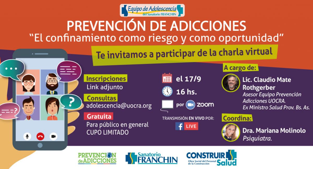 En esta charla abordaremos los siguientes temas: - Qué son las drogas y qué consecuencias tiene su consumo. - El alcoholismo adolescente como patrón de inicio. Influencia del entorno. - Cambios en los modelos familiares. La familia como factor de protección y la familia como factor de riesgo. La charla estará a cargo del Lic. Claudio Mate Rothgerber (psicólogo. Asesor del Equipo de UOCRA Prevencion de Adicciones. Ex Ministro de Salud de la Prov. de Bs As) y será coordinada por la Dra. Mariana Molinolo (psiquiatra, integrante del UOCRA Equipo de Adolescencia del Sanatorio Franchin del Equipo de Prevención de Adicciones de UOCRA). Dirigido al público general. Cupos limitados. Actividad gratuita. Modalidad: Zoom Fecha y hora: Jueves 17/9. 16 hs Para recibir tu link de acceso a la charla inscribite aca: https://forms.gle/fe8uZHhzkxKk3sXh9 Consultas: [email protected] Te esperamos para contestar tus inquietudes. Agendatelo!! Invita Equipo de Adolescencia del Sanatorio Franchin