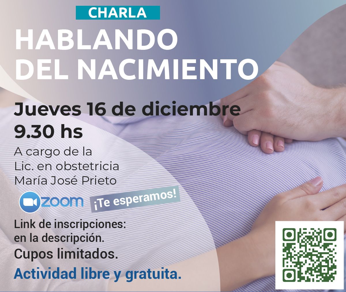 Prepararnos, conocer y hablar de lo que nos está pasando permite enfrentar este momento y por supuesto prepararnos para el nacimiento. Compartiremos información acerca de las contracciones y evolución del trabajo de parto, sobre como sucede y que es lo que le pasa al bebé en este momento para acompañar y entender el proceso. La charla estará a cargo de la Lic. en obstetricia María José Prieto. Dirigido a embarazadas, sus parejas/familia a partir del segundo trimestre. Fecha y hora: Jueves 16/12. 9.30 hs. Modalidad: Zoom Cupos limitados. Consultas Actividad libre y gratuita. No hace falta haber estado en la primera charla para participar de la segunda. ¡Te esperamos!Para recibir tu link de acceso a la charla inscribite acá: