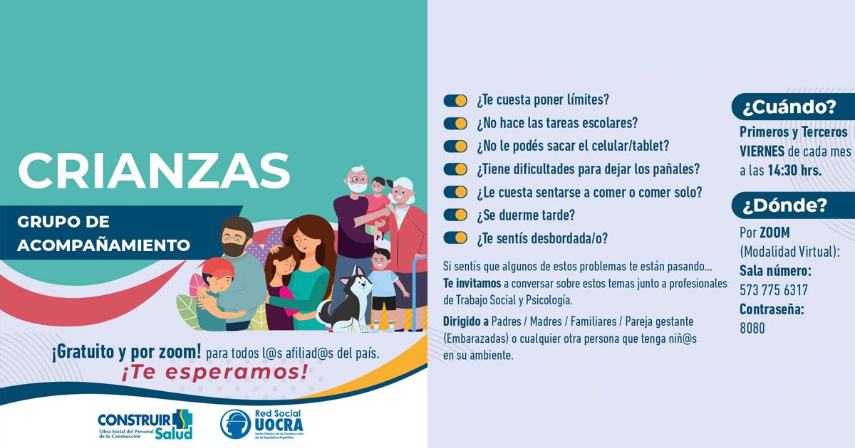 Dirigido a padres / madres / familiares / Pareja gestante (Embarazadas) o cualquier otra persona que tenga niñ@s en su ambiente. ¿Cuándo? Primeros y Terceros viernes de cada mes a las 14:30 hrs. COMIENZA EL VIERNES 01/4 ¿Dónde? Por ZOOM (Modalidad virtual) Sala número: 573 773 6317 Contraseña es 8080 Gratuito para todos los afiliad@s del país. ¡Te esperamos!