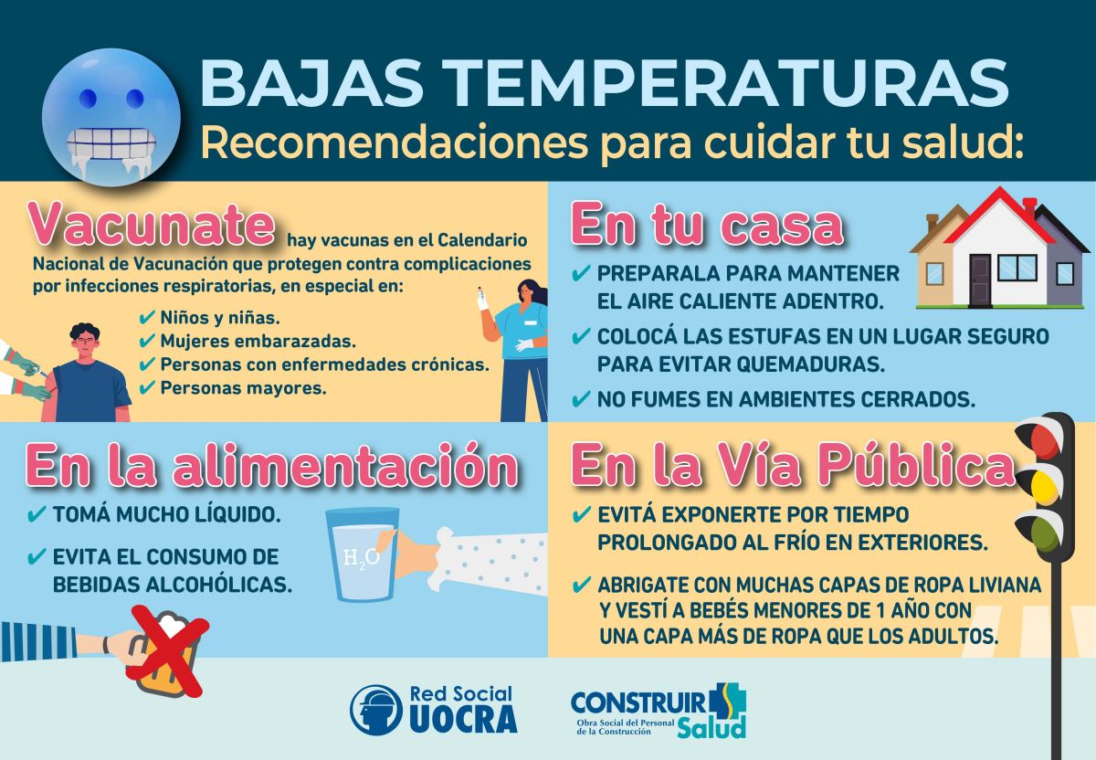 La exposición al frío nos hace más vulnerables a algunas enfermedades, pero estos consejos pueden ayudarte a disminuir esos riesgos: Vacunate: hay vacunas incluidas en el Calendario Nacional de Vacunación que protegen contra las complicaciones por infecciones respiratorias, en especial en los niños y las niñas, mujeres embarazadas, personas con enfermedades crónicas y personas mayores. En tu casa: • Preparala para mantener el aire caliente adentro: en lo posible sellá las grietas y espacios por las que pueda ingresar aire del exterior. • Mantenela calefaccionada en forma segura: verificá el correcto funcionamiento de estufas a gas para prevenir la intoxicación por monóxido de carbono. Si usás estufas eléctricas evitá usar alargadores/prolongadores para enchufarlas y asegurate que no haya riesgo de tropezarse con el cable. • Colocá las estufas en un lugar seguro, para que no se puedan tocar y así evitar quemaduras. • Si el único medio para calefaccionar el hogar es un brasero, encendelo fuera del hogar e ingresalo cuando no se observe el desprendimiento de humos. También es importante que mantengas ventilación en el ambiente para que ingrese aire limpio y retirarlo del hogar antes de dormir. • Vigilá la temperatura de las habitaciones de niños pequeños durante la noche y madrugada. Ellos pierden calor corporal más rápido que un adulto. • No fumes en ambientes cerrados En la alimentación: • Mantené una alimentación saludable, priorizando el consumo de alimentos frescos y mínimamente procesados. • Tomá mucho líquido. • Evita el consumo de bebidas alcohólicas: no ayuda a combatir el frío, por el contrario, produce una falsa sensación de calor debido a la dilatación de los vasos sanguíneos, lo que acelera la pérdida de calor en todo el cuerpo. En la vía pública • Evitá exponerte por tiempo prolongado al frío en exteriores y en lo posible, mantenete en movimiento para generar más calor corporal: camina, levántate y sentarse, mové los brazos y piernas las extremidades, etc. • Abrigate con muchas capas de ropa liviana: mantienen el calor mejor que un solo abrigo pesado. Mantenete seco, la ropa húmeda enfría el cuerpo rápidamente. • Respirá por la nariz y no por la boca: el aire se calienta al pasar por las fosas nasales y así disminuye el frío que llega a los pulmones. • Vestí a los bebés menores de 1 año con una capa más de ropa que las usadas por los adultos. Los niños y niñas mayores de 1 año pueden usar la misma cantidad de ropa que un adulto.