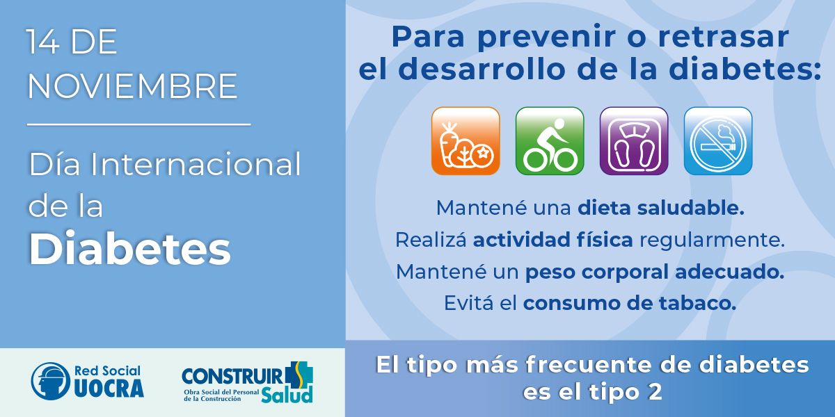 Si bien hay varios tipos de diabetes a más frecuente es la diabetes tipo 2, que ocurre generalmente en adultos y se asocia a antecedentes familiares de diabetes y al exceso de peso. Que podemos hacer para prevenir el desarrollo de diabetes tipo 2? Para prevenir o retrasar el desarrollo de la diabetes tipo 2 se debe mantener una dieta saludable, realizar actividad física regular, mantener un peso corporal normal y evitar el consumo de tabaco. SI tenés diabetes es importante que recibas información acercas de los cuidados, tratamientos y seguir las indicaciones del equipo de salud. Consulta en tu centro de salud periódicamente, tanto si tenés diabetes como para que te ayudemos a adoptar hábitos que te ayuden a prevenirla.