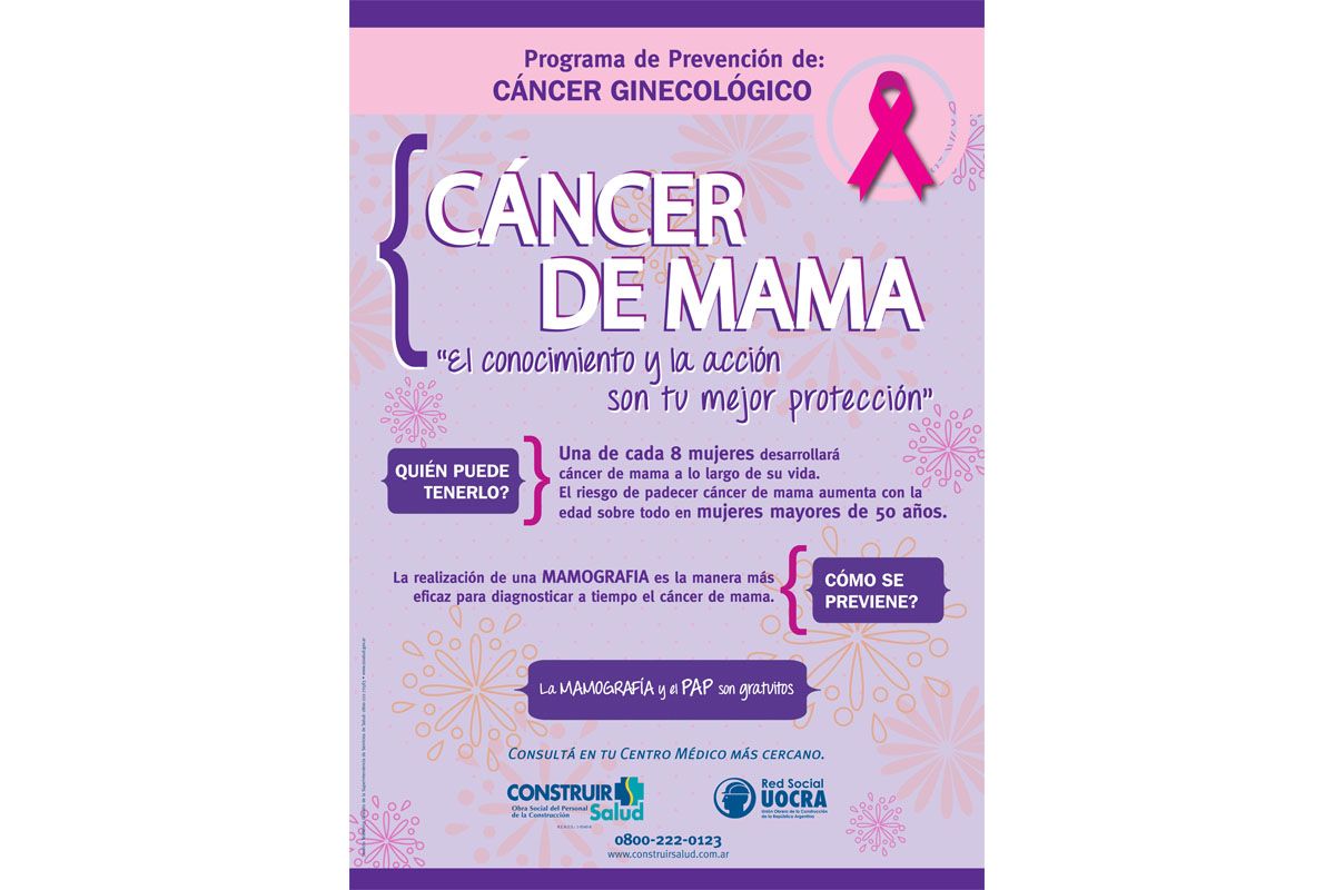 Mas del 75% de las mujeres con cáncer de mama no tiene ninguna antecedente familiar de dicha enfermedad. La detección temprana es fundamental, ya que los tumores de menos de un centímetro tienen hasta el 90% de posibilidades de curación. Quienes pueden tenerlo? Todas las mujeres pueden desarrollar esta enfermedad ya que el origen de este cáncer es desconocido. Algunos factores de riesgo pueden generar mayor posibilidad de sufrir esta enfermedad, como antecedentes personales o madre o hermanas con de cáncer de mama, inicio de la menstruación a edad temprana, edad del primer embarazo mayor a 30 años, no haber tenido hijos, obesidad. El riesgo de padecer cáncer de mama aumenta con la edad sobre todo en las mujeres mayores de 50 años. Puede prevenirse? Al no conocerse la causa no se puede prevenir, pero se puede detectarse precozmente . Como puede detectarse? A través de la mamografía, que es el método de elección y más eficaz para la detección precoz. La realización de la mamografía es gratuita en la obra social.