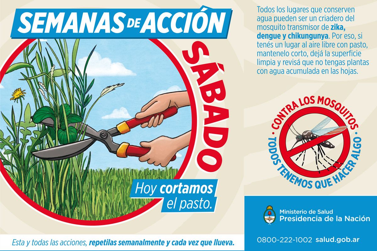 Todos los lugares que conserven agua pueden ser un criadero del mosquito transmisor de zika, dengue y chikungunya. Por eso, si tenés un lugar al aire libre con pasto, mantenelo corto, dejá la superficie limpia y revisa que no tengas plantas con agua acumulada en las hojas. Contra los mosquitos todos tenemos que hacer algo.